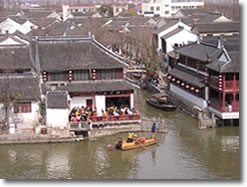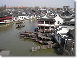 上海の西郊外「淀山湖」の湖畔にある水郷です。豫園など上海市内の観光地が金や赤など
