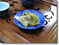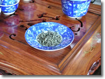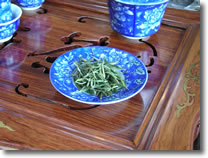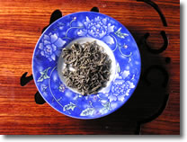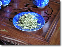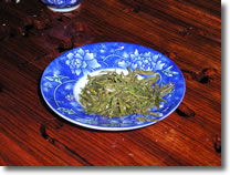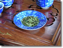 代表的な中国緑茶のひとつで、くるくる巻の葉に毛がいっぱいついた、独特の形をしています。果樹園で茶樹を育てるらしく、フルーティな味わいが特徴です。(写真のものは特級品ではないため、フルーティと言えるほどの香りではありませんでした。)