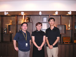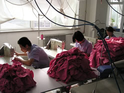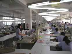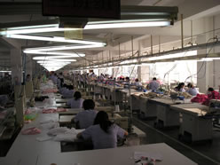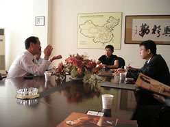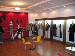 今回は、アメリカと大連の合弁ブランド「MEIOULAN(美欧嵐)」の高社長(右写真:真ん中)にお話を伺いました。「MEIOULAN」は大連を中心に、中国全土で100前後の専門店を持つブランドで、大連保税区内に自社工場を持っておられます。今回は工場の見学も兼ねてお邪魔しました。